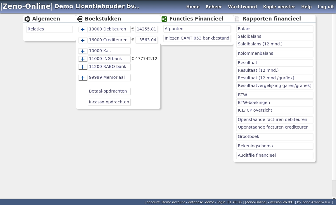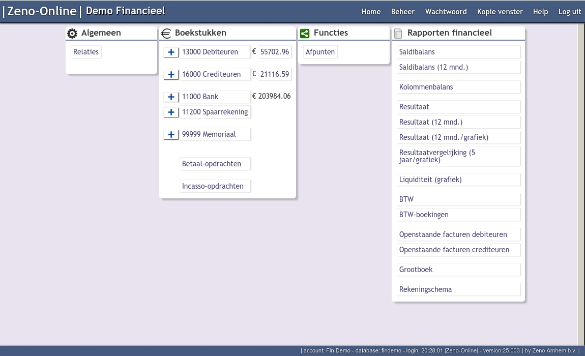 Het scherm bestaat van links naar rechts uit 4 onderdelen: Algemeen, Boekstukken, Functies en Rapporten.